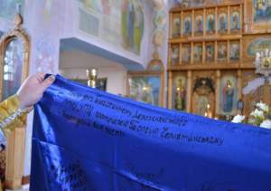 Настоятель Михайлівського храму міста Деражня Хмельницької єпархії, благочинний Деражнянського округу протоієрей Георгій Чернятинський і його паства одержали від воїнів Збройних сил України подячну відзнаку: військовий прапор України, підписаний військовослужбовцями, повідомляє пресслужба Хмельницької єпархії.