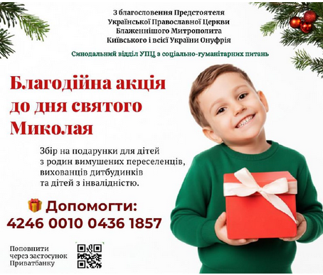 «Сьогодні багато дітей через війну втратили домівки й близьких. Для них день святого Миколая — це промінчик надії в непростий час. Поділіться своєю любов’ю! Станьмо помічниками святителя й подаруймо дітям частинку добра, радості та любові», - закликають у Соціальному відділі УПЦ.