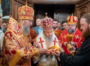 Предстоятелю співслужили керуючий справами УПЦ митрополит Бориспільський і Броварський Антоній, архієпископ Білогородський Сильвестр, архієпископ Добропільський Спиридон, архієпископ Ірпінський Лавр, архієпископ Бородянський Марк, гості у священному сані та духовенство монастиря.